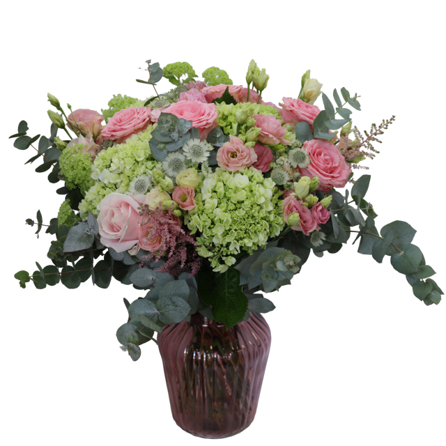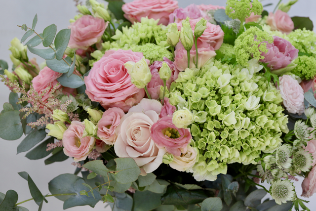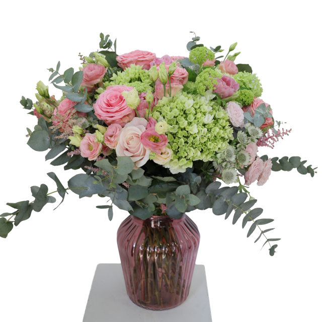 Le bouquet ARÔME est une composition élégante qui marie subtilement les tons rose tendre et vert frais. Principalement composé de roses roses et d’hortensias blanc/vert, ce bouquet est enrichi de fines fleurs délicates, apportant volume, texture et légèreté.