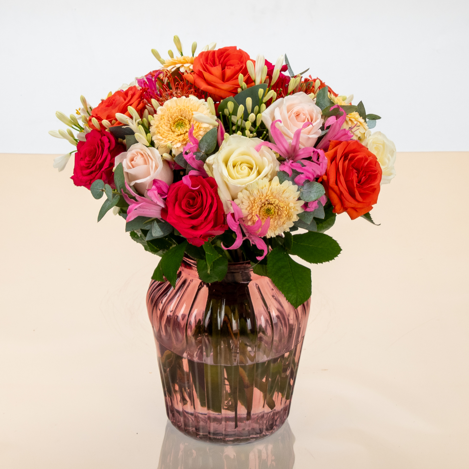 - Une composition qui marie la vivacité des roses variées à la douceur des fleurs fines.